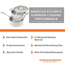 Details: Move over takeout, we're having leftovers thanks to the American Kitchen's Make Enough for Leftovers Cookware Set. With a smooth satin finish and riveted handles this durable set of stainless steel cookware features a 3-quart sauce pan and a 12-inch sauté pan-each with a recessed lid-and a 10-inch non-stick fry pan. Two layers of professional grade, high quality stainless steel make this an eye-catching set, but it's the hidden aluminum layer that gets the job done, providing superior heat conduction for even cooking. Non-conductive stainless steel handles stay cool to the touch no matter how high you turn up the heat. Conveniently dishwasher safe and usable on any cooking surface. Experience the quality of our made-in-the-US cookware today!